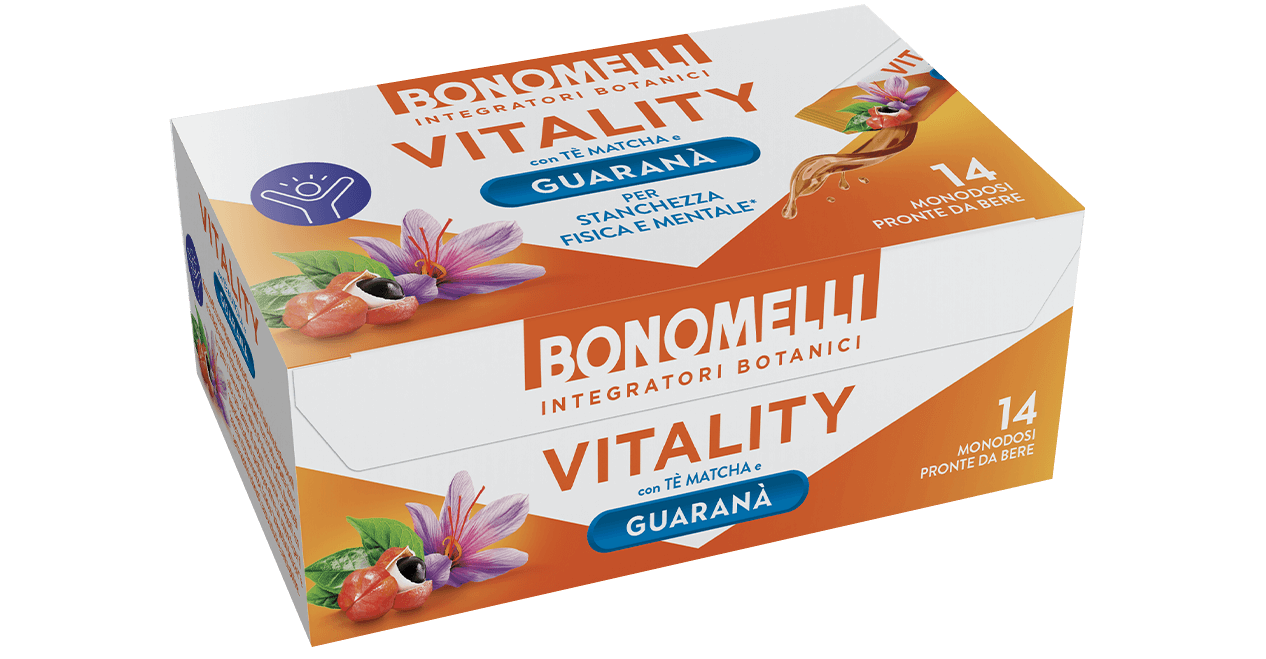 Bonomelli VITALITY is a Food Supplement formulated with Matcha Tea and Guarana, Saffron, Vitamin B6, Thiamine (Vitamin B1) and Pantothenic Acid (Vitamin B5) that contribute to the reduction of tiredness and fatigue. Contains caffeine (total 7mg per stick)